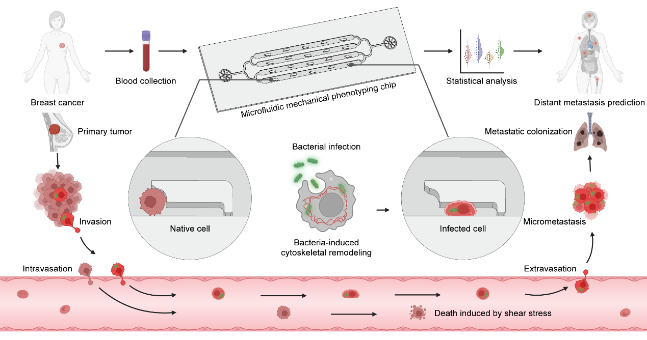 近年来的研究表明,肿瘤组织内定植的细菌与癌症进展密切相关。部分胞内细菌能够通过重组宿主细胞的骨架结构、降低细胞硬度,使癌细胞具备更强的变形能力,从而更易穿过微血管、在循环系统中生存并促进远端转移。然而,如何从海量血细胞中高效捕获并精准识别这些极其稀有且高度可变形的“被感染循环肿瘤细胞”,一直是液体活检和癌症预后评估领域的重大难题。