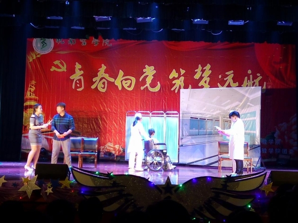晚会开始前,一段为即将毕业和实习学生精心准备的祝福视频令现场气氛顿时升温。随着炫丽壮观的开场舞《我和我的祖国》拉开晚会帷幕,整个会场洋溢着红色的海浪,女生独唱《野子》传达出不怕逆境、勇往直前的正能量,展现圆、游、变、幻之美的古典舞《 舞韵 》和节奏感十足的现代舞《The end》、《Here with you》带给同学们柔美与动感的视觉之美,四手联弹《音乐畅想》充分展现出音律悠扬之美。一首《曾经的你》从演唱到伴奏都由学生现场完成,青春活力感染全场观众。本场晚会的语言类节目也是别出心裁、妙趣横生,双簧《我还有一句话》、相声《那些年》中的演员搭档们配合默契,夸张而又生动的表演数次引来热烈的掌声,小品《伪装包》则以医患关系这一热点为主题,内容发人省醒。辅导员王康淇和周超与学生们同台演出的《贝加尔湖畔》和《Bang Bang Bang》节目,在带给大家欢笑的同时增进了师生情感。晚会在大合唱《明天会更好》和《歌唱祖国》中圆满结束,大家唱出了自己心声,唱出了对党和祖国的真情祝愿。