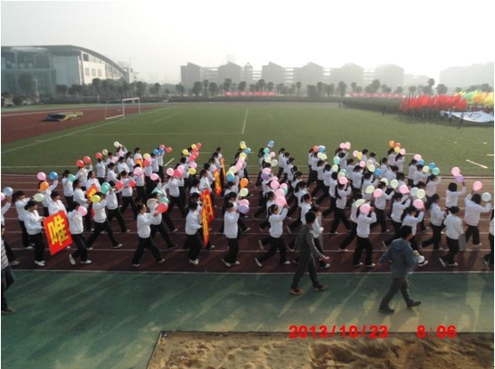 整齐的方阵队伍 在接下来的各项比赛中,我院的运动员们顽强拼搏、奋勇争先,相继在女子跳远、跳高、100米、200米、4*400米、1500米、3000米,男子200米、110米栏、铅球、跳远、团体1500等诸多项目中取得骄人成绩,特别是仰肖敏和徐卓同学,连续两年荣获女子100米,200米和男子110米栏第一名的好成绩。看台上,我院的拉拉队们也不甘示弱,摇旗呐喊,助威有力。