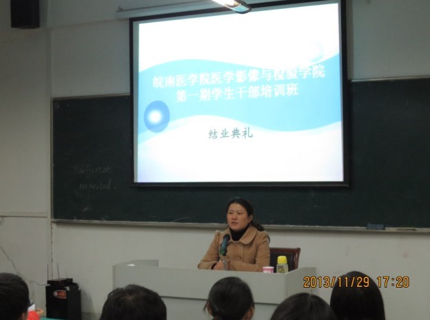 2013年11月29日下午,医学影像与检验学院首届学生干部培训班圆满结束。院党总支书记、副院长张建英,党总支委员孙开慧、魏巍及各年级辅导员出席了结业典礼。