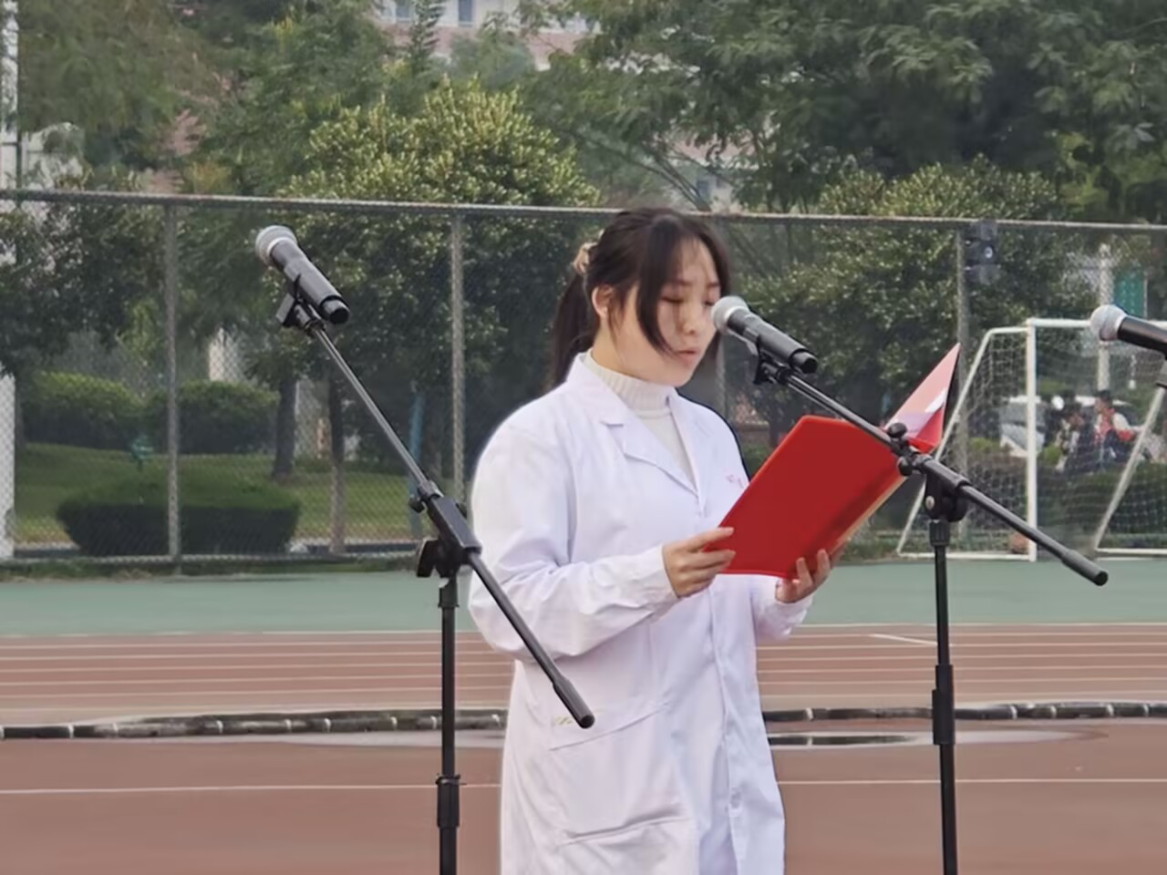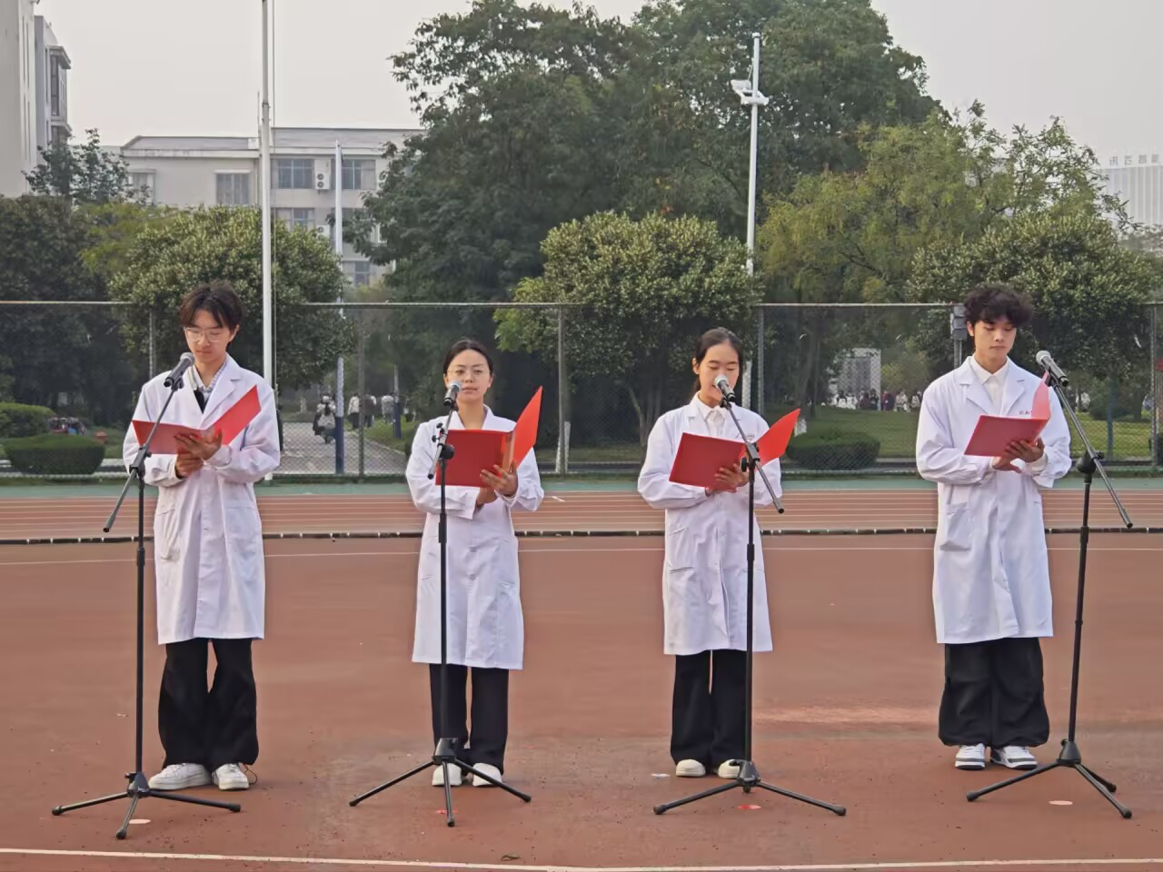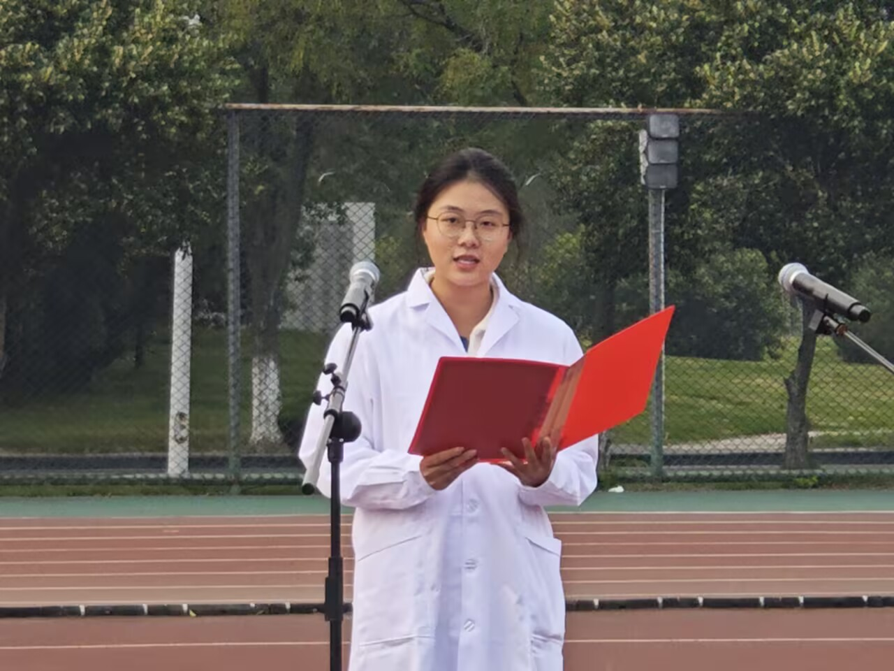 仪式上,青马班学员代表影技2301班滕婕同学进行了主题为“铭记伟大胜利,青春勇担使命”的发言,回顾那段浴血奋战的岁月,讲述革命先烈的英勇事迹,号召新时代青年要铭记历史、缅怀先烈、珍爱和平、开创未来,在实现中华民族伟大复兴的征程中贡献青春力量。随后,2025级新生代表翟心语同学进行演讲,表达了新时代青年学子传承伟大抗战精神、勇担时代使命的坚定决心,承诺将以实际行动践行医学生誓言。触动人心的发言之后,师生代表共同进行了抗战主题诗朗诵,深情回顾那段波澜壮阔的历史,每一句诵词都是对先烈的致敬,对和平的呼唤。仪式最后,全体师生齐声高唱《歌唱祖国》,用嘹亮的歌声抒发对祖国的无限热爱和美好祝福。
