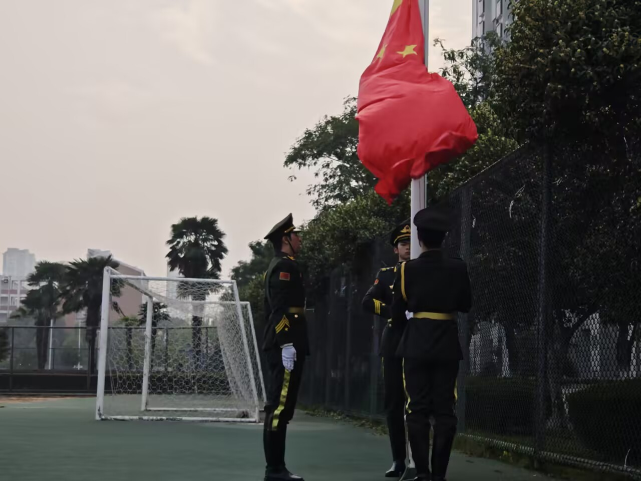 清晨七点,晨光熹微,同学们列队整齐,升旗仪式准时开始。国旗护卫队步伐坚定有力,护送着五星红旗入场。随着激昂高亢的《义勇军进行曲》奏响,五星红旗缓缓升起。全体师生神情庄重,目光紧紧追随国旗,嘹亮的国歌声在校园里回响,爱国之情在每个人心中激荡。