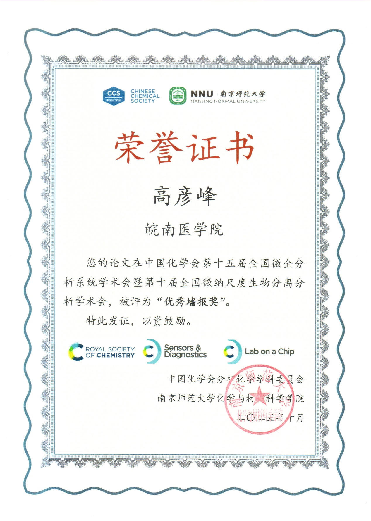 我校williamhill的高彦峰老师受邀参会并展示了题为《基于CRISPR-Cas系统的微流控平台用于疾病的早期诊断》的研究成果。经过严格的评审,高彦峰老师的墙报作品在众多参评作品中脱颖而出,荣获大会“优秀墙报奖”。此次获奖充分体现了williamhill中文在微流控分析与生物医学工程交叉领域的科研实力和创新活力,进一步提升了学校在前沿科学研究领域的学术影响力。(高彦峰/文、图)