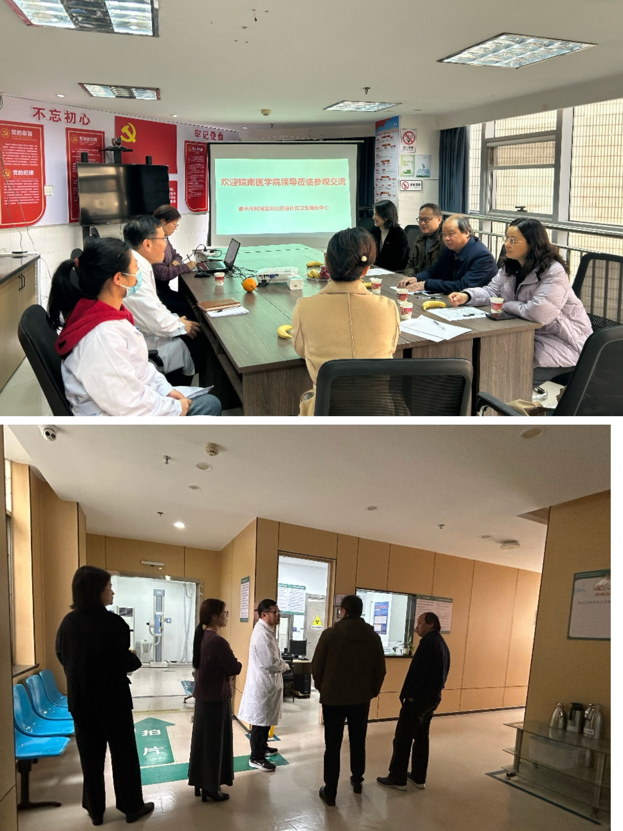 12 月 12 日,考察组一行前往衢州市柯城区府山街道社区卫生服务中心开展访企拓岗活动,中心主任蓝建明主持交流会议。蓝建明主任全面介绍了中心的服务范围、科室建设、医疗团队及基层医疗服务开展情况,重点分析了基层医疗卫生机构在医学专业人才方面的需求现状与引进计划。衢州柯城幸福医院吴琳珍主任补充介绍了基层医院的业务拓展方向及不同层次人才的需求标准,表达了与学校和学院建立长期人才合作关系的强烈意愿,希望吸纳更多优秀毕业生扎根基层、服务地方医疗事业。赵劲松院长详细介绍了学院的人才培养特色、毕业生专业能力及就业导向。会后,考察组在相关负责人陪同下走访了中心诊疗区域,实地了解基层医疗服务模式,进一步夯实了合作基础。