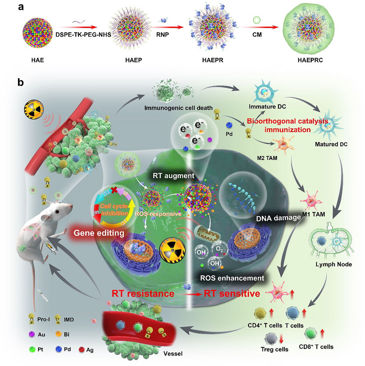 目前,针对上述挑战,研究团队创新性地构建了一种集高熵合金放疗增敏、CRISPR/Cas9基因编辑、生物正交免疫激活以及微流控芯片分析技术于一体的多功能纳米治疗平台(HAEPRC)。该平台以由金(Au)、铋(Bi)、铂(Pt)、银(Ag)和钯(Pd)组成的高熵合金为核心,通过肿瘤细胞膜包裹实现同源靶向,并负载靶向PLK1的CRISPR/Cas9系统,实现对肿瘤细胞周期的精准干预与调控。